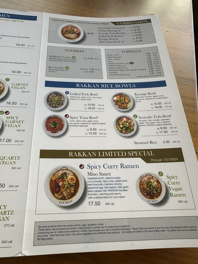 [Miso Sauce] Vegetable broth, sesame paste, grilled pork, seasoned veggies, green onion, seasoned egg, fried garlic, black pepper with RAKKAN noodles. *All noodles are boiled in the same boiling water. Soup and some toppings contain gluten.